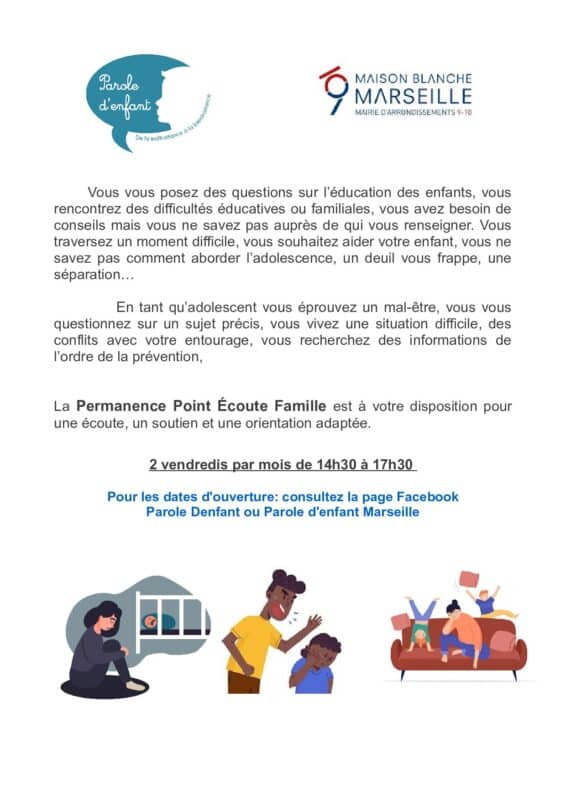 Pour la rentrée scolaire, notre lieu d'accueil POINT ECOUTE FAMILLE à la Maison de quartier de la Cayolle est ouvert pour les ados et les parents, de 14h30 à 17h30, deux vendredis par mois!