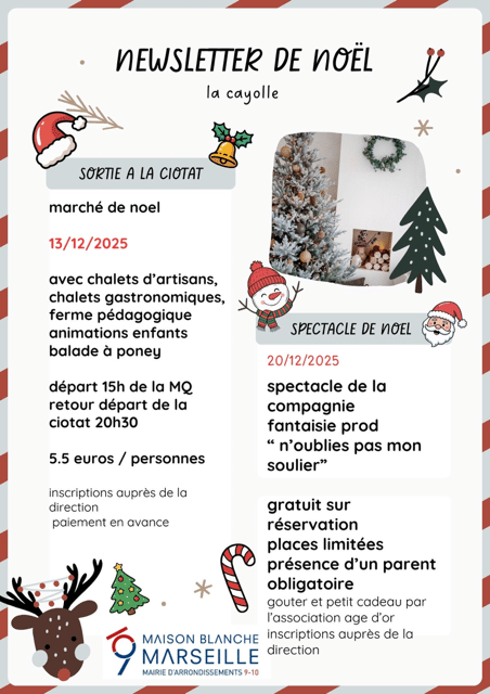 Le Noël des enfants avec goûter et spectacle "N'oublie pas mon soulier" (gratuit sur réservation, places limitées) est organisé par la Mairie des arrondissements 9/10 et l'association Age d'or, à la Maison La Cayolle, samedi 20 décembre 2025 à partir de 15h.