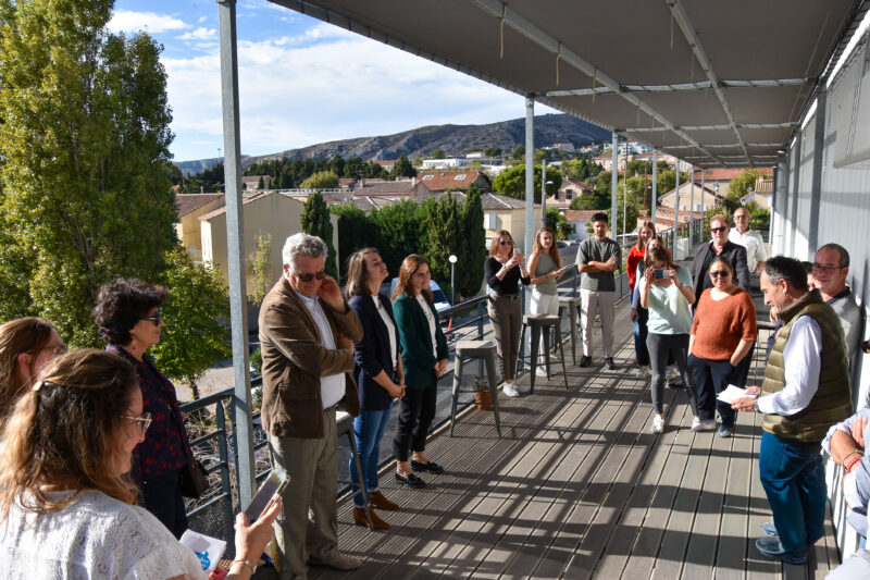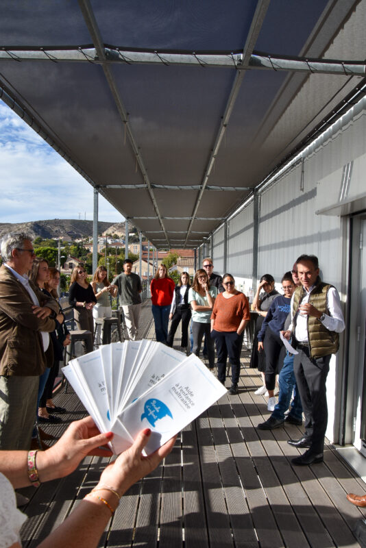 La réception se déroulait sur la terrasse extérieure du bâtiment sous un soleil radieux avec tous les employés réunis pour l'occasion.
