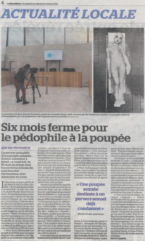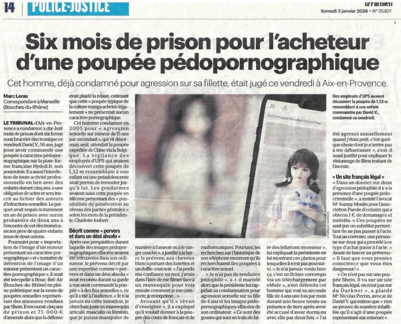- Procès des poupées pédopornographiques : un homme condamné à 6 mois de prison ferme sous bracelet électronique - France3 PACA "Nous sommes aujourd'hui confrontés à un nouveau phénomène, nous dit-on, mais qui n'est pas si nouveau que ça", a réagit Maître Joanny Moulin, avocat de l'association Parole d'Enfant, qui représente les parties civiles. Il rappelle que depuis des dizaines d'années dans les affaires impliquant des pédocriminels, "il y avait une fois sur deux la présence de poupées sexuelles. Ceux d’aucun appelle 'poupées pédopornographique's, mais moi, je les appelle les 'poupées pedocriminelles'."