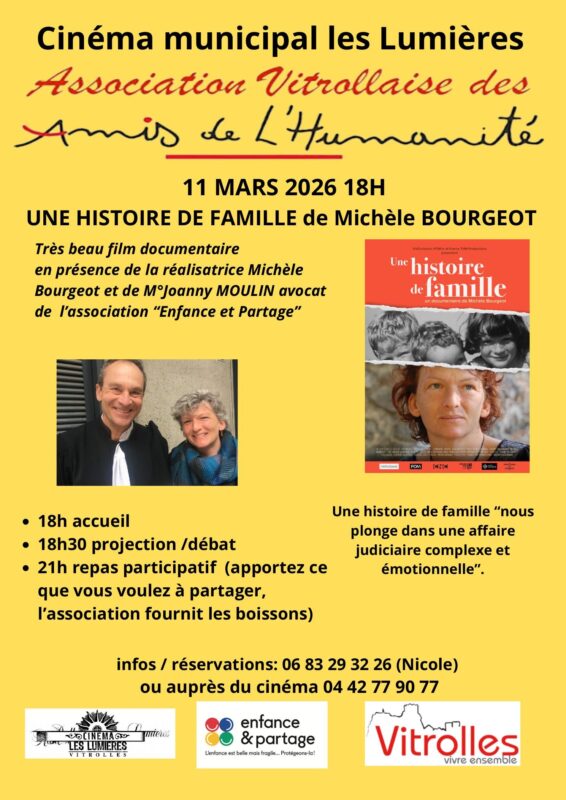 Mercredi 11 MARS 2026 à 18H: Projection du Documentaire “Une histoire de famille” au cinéma Les Lumières à Vitrolles, en présence de la réalisatrice, Michèle Bourgeot et de Maître Joanny MOULIN, avocat de l’association “Enfance et Partage” et Président de l'association Parole d'enfant Marseille.